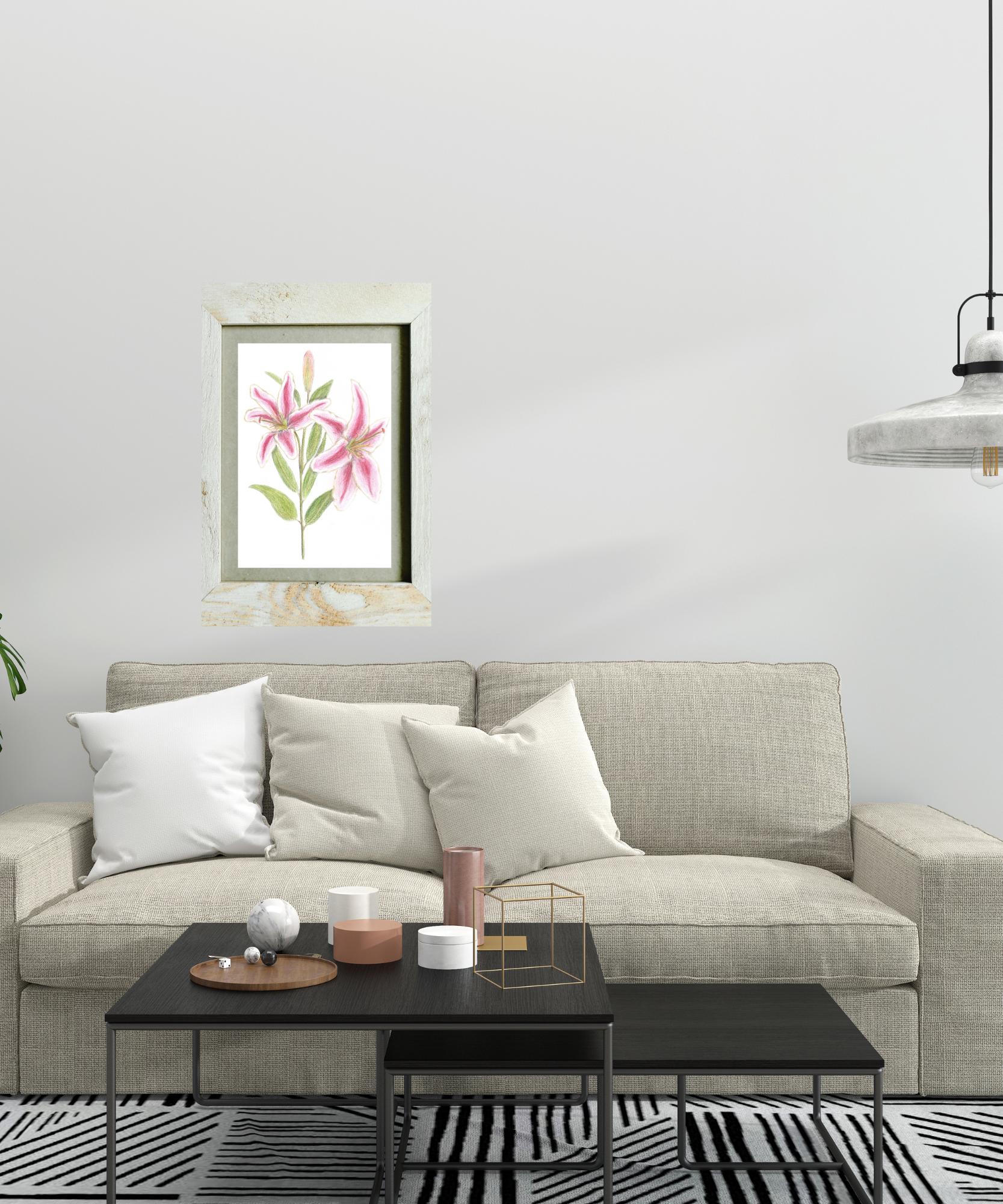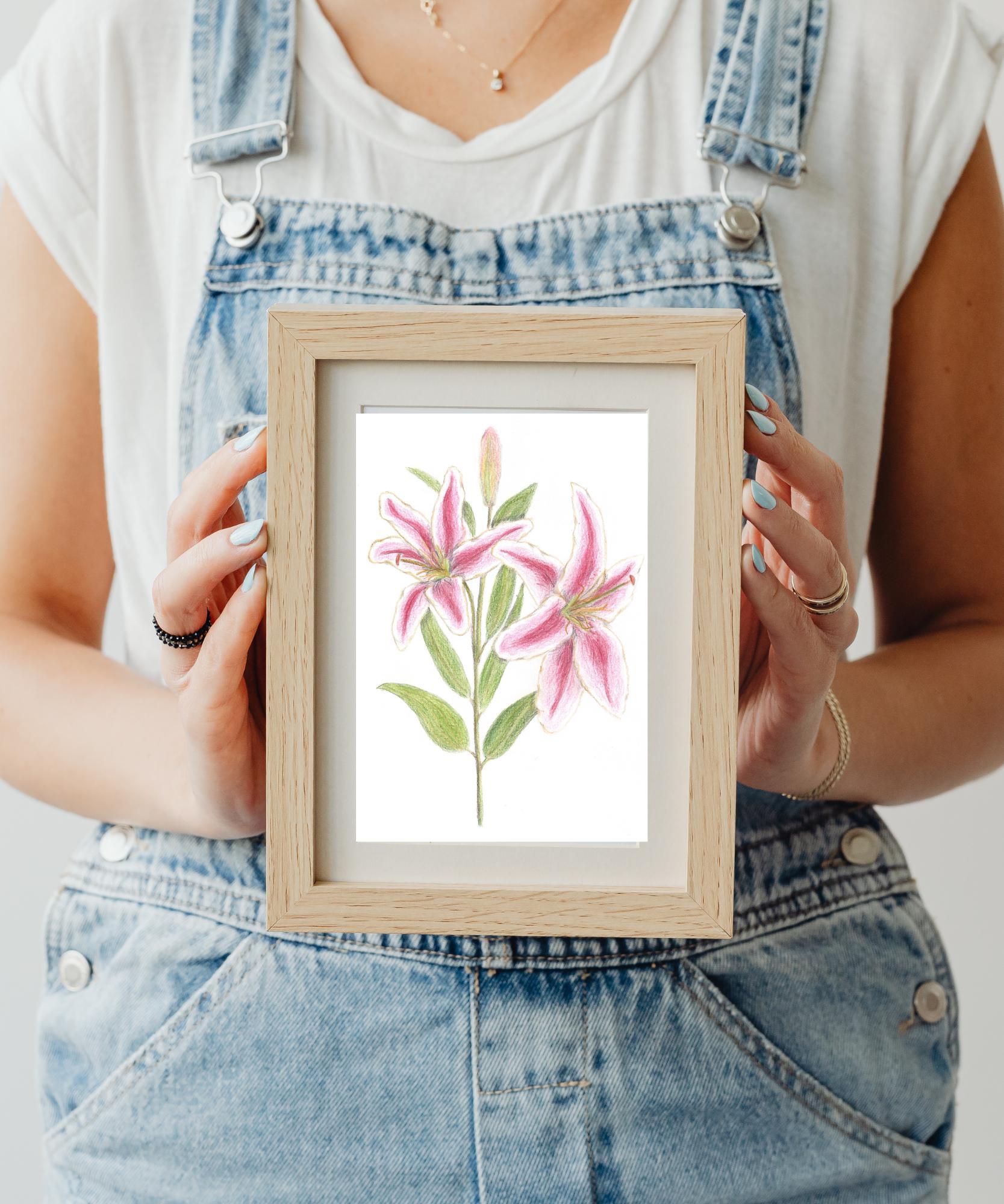 Bring elegance and tranquility to your space with this hand-drawn botanical artwork of a pink lily. A delicate blend of soft colors and natural texture, perfect for adding charm to any room – from your bedroom to your workspace.