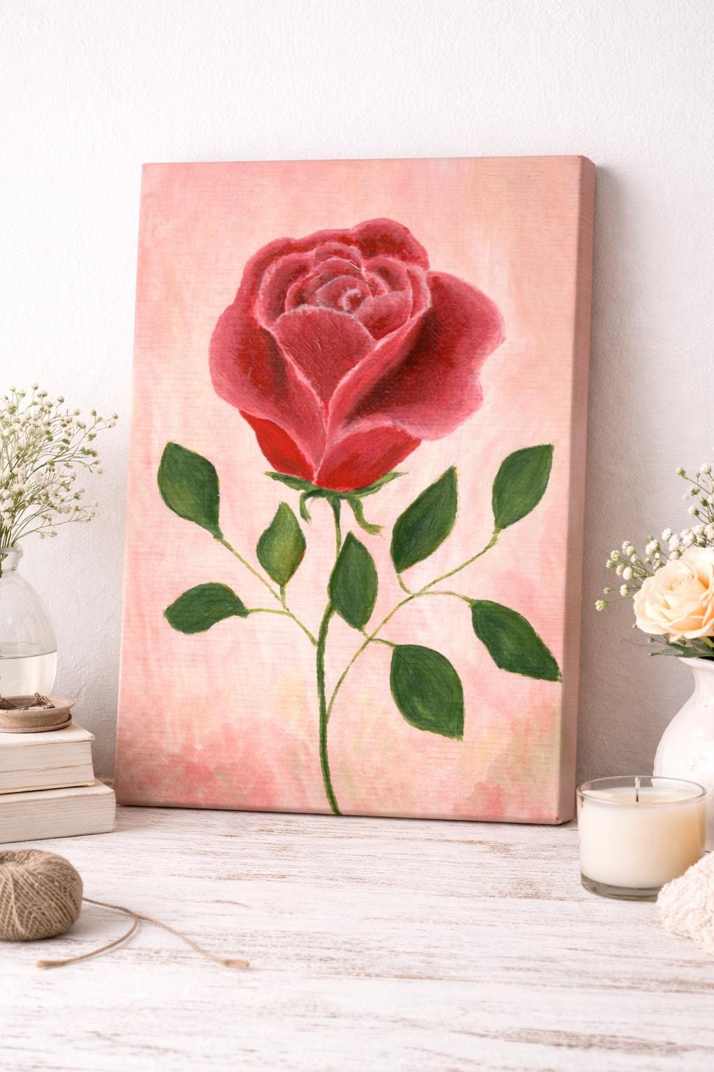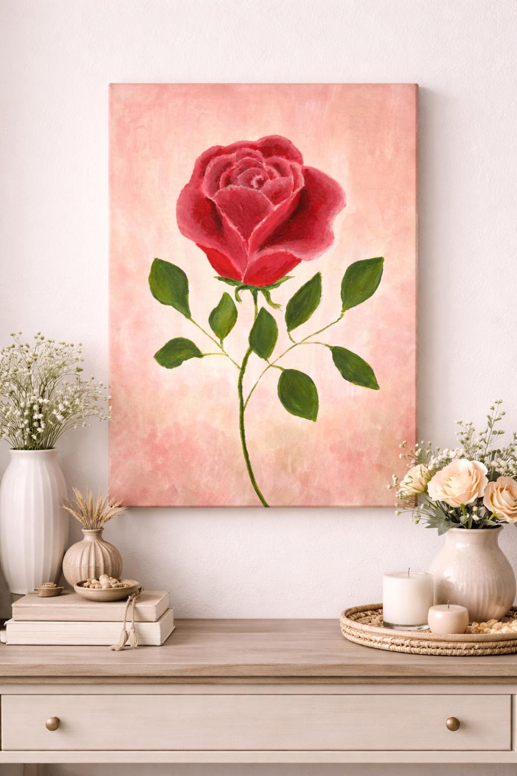 Bring elegance and tranquility to your space with this hand-painted pink rose artwork in acrylic. A delicate blend of soft colors and natural texture, perfect for adding charm to any room – from your bedroom to your workspace.